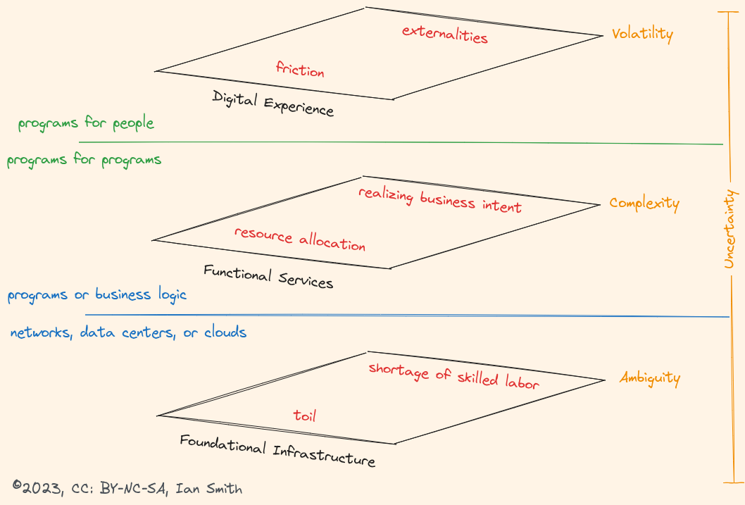 - At the bottom is where the foundational infrastructure of the firm resides. Here is where the real assets live, where the invisible, bubbling, hyperactive chaos of the interface between the infrastructure and the uses of that infrastructure is, and where the real work happens. This layer is defined by ambiguity, and by how the people and the organization creates clarity in response to that ambiguity.